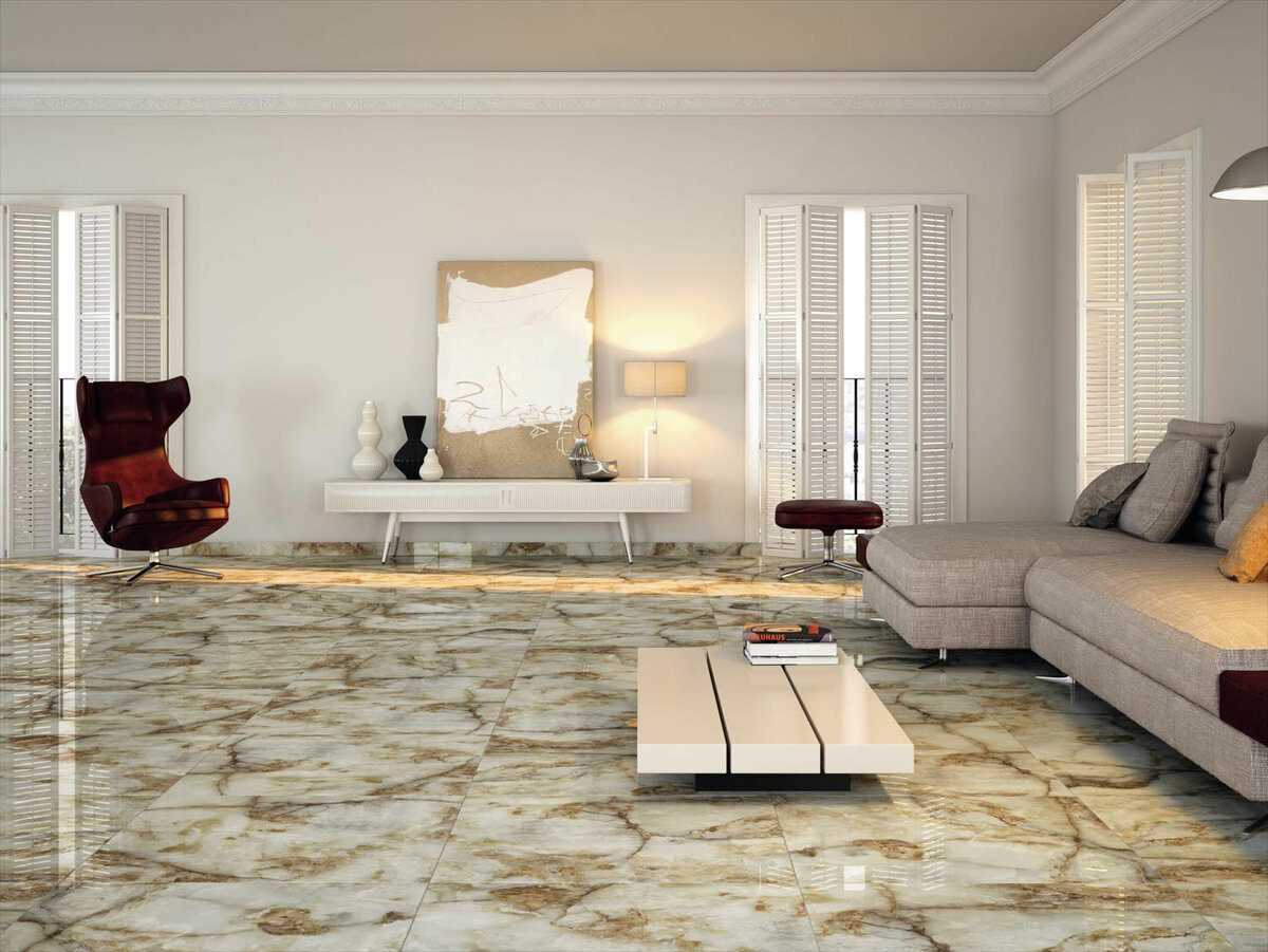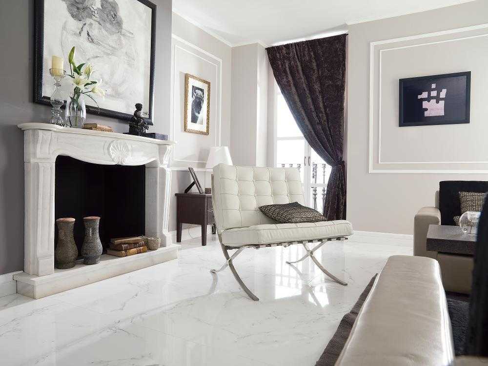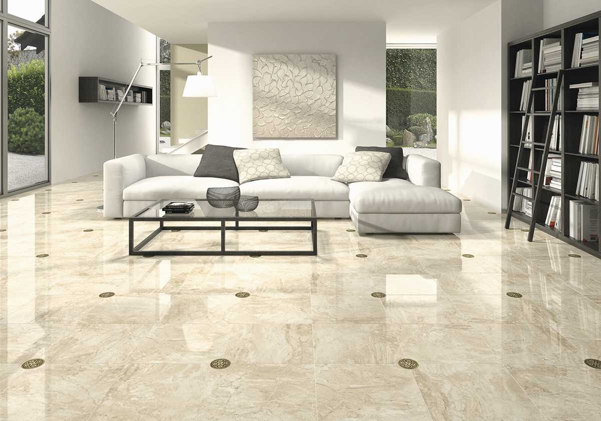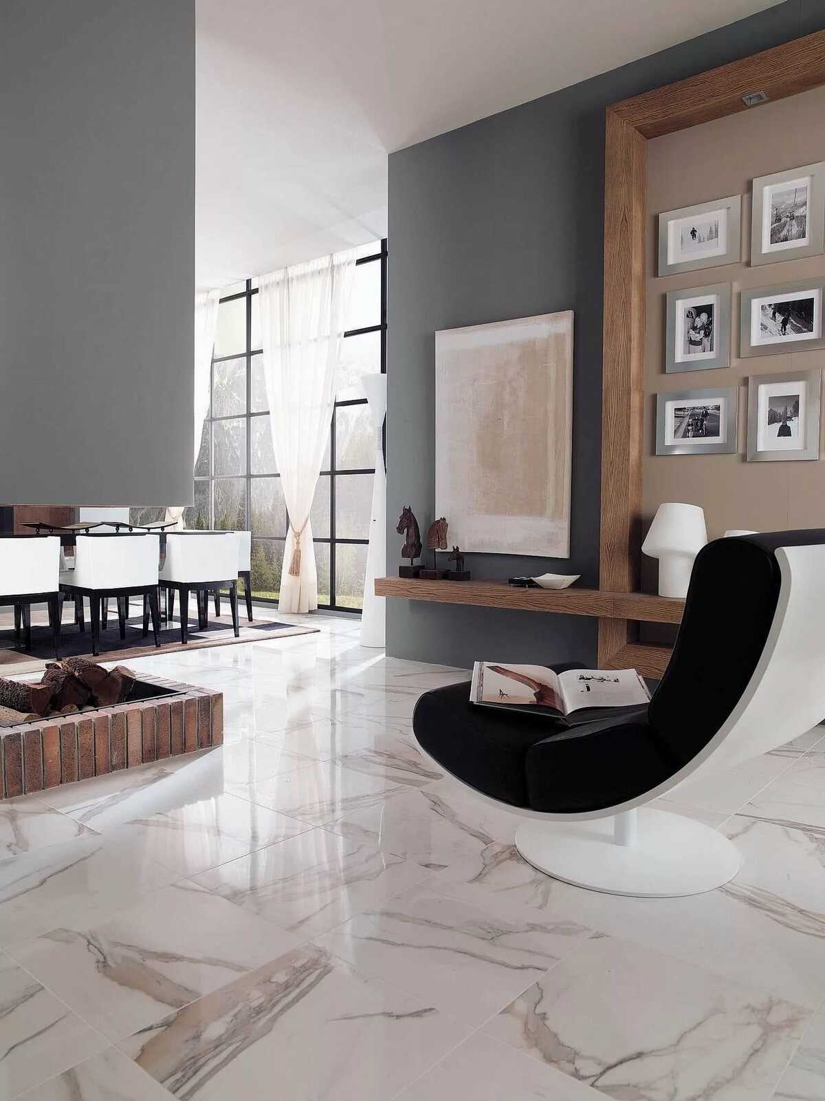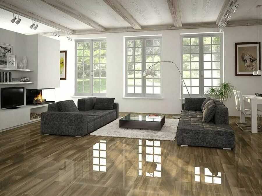 Если вам нравятся блестящие полы, то ни один другой материал не будет так хорош, как полированная керамическая плитка. Блестящая поверхность будет красиво отражать и рассеивать свет, освещая всю комнату. Плиточный пол идеально подходит, когда гостиная соединена с кухней — благодаря плитке пол будет равномерным, оптически соединяющим обе комнаты.