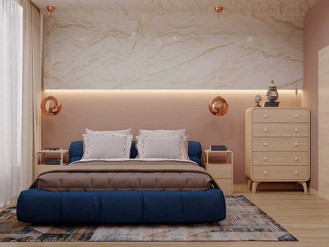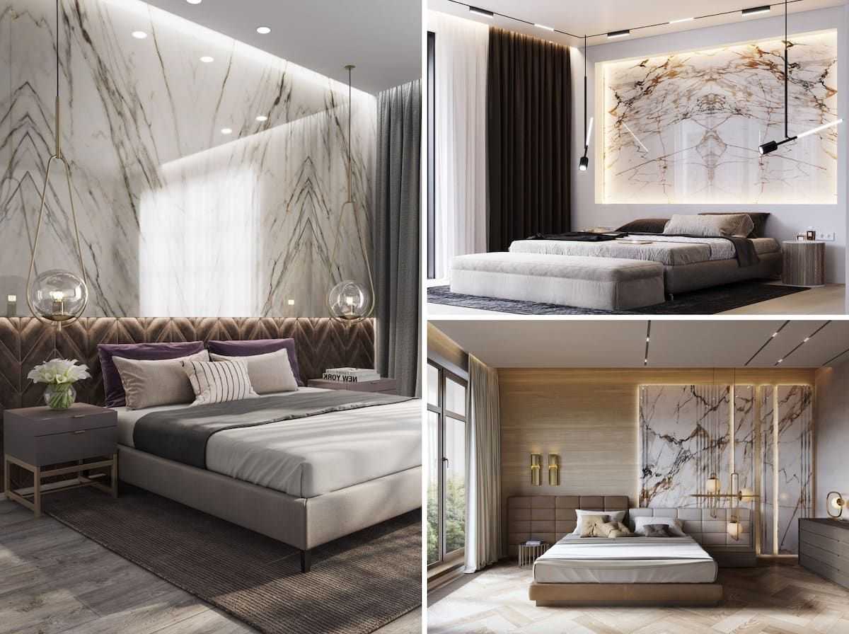 Дизайн интерьера «под мрамор» одновременно и нежный, и солидный, и фундаментальный. Мраморный узор занимает ведущие позиции в вопросах отделки и дизайна. Поскольку спальню отделать камнем не получится, для этого дизайнеры предусмотрели обои с узором «под мрамор».