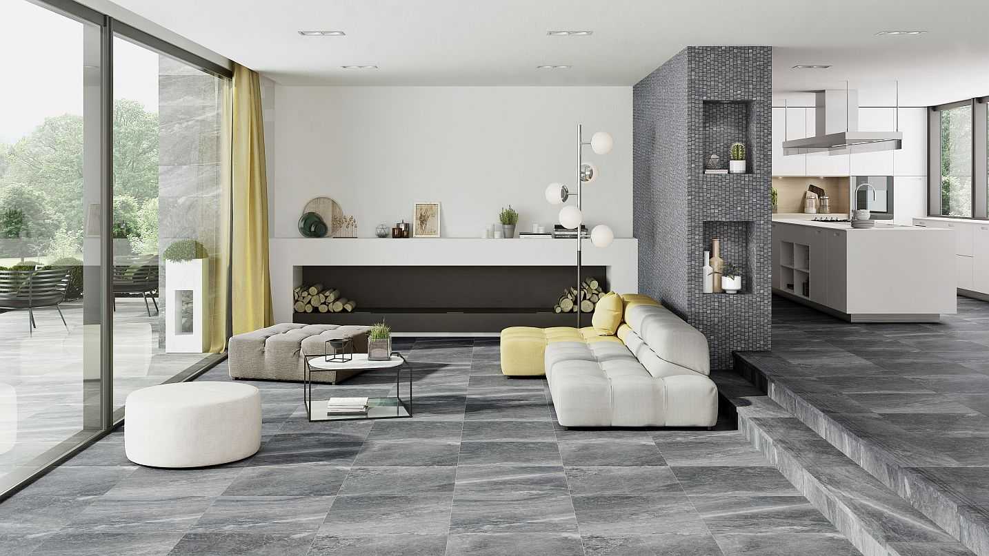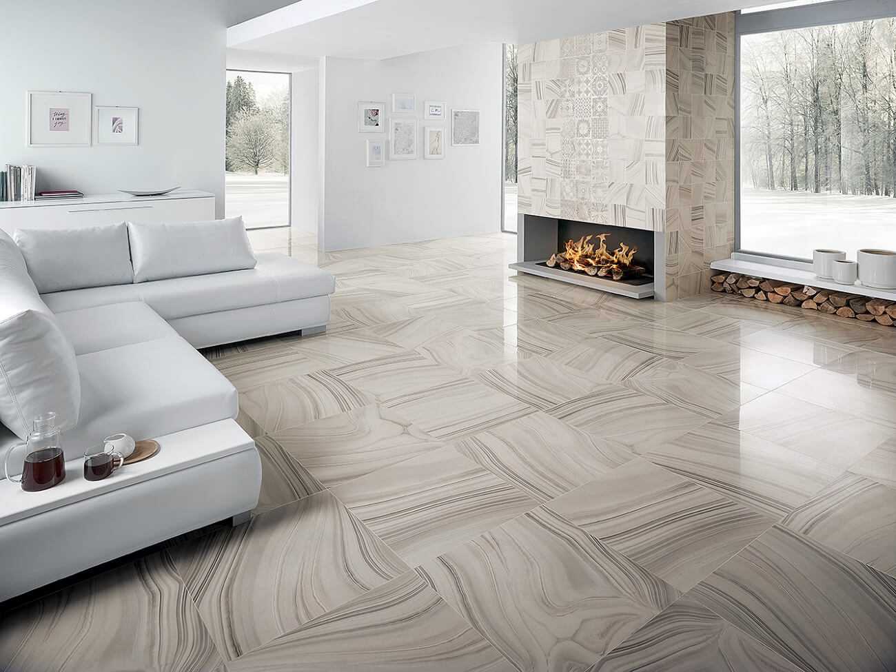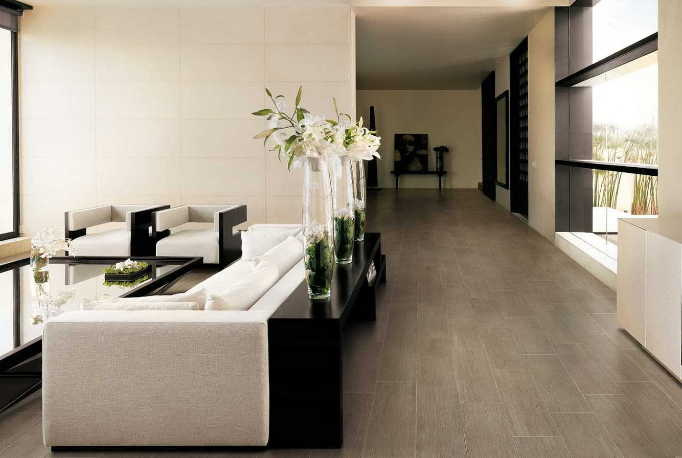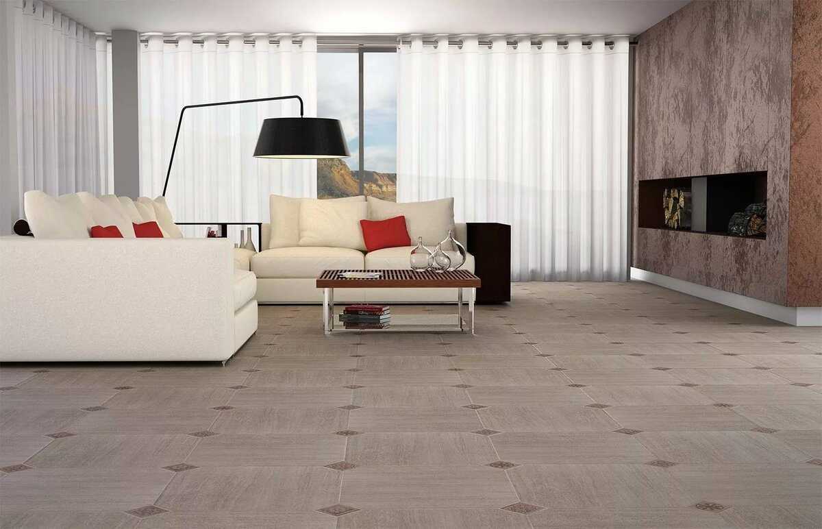 Плитка является популярным продуктом и поэтому доступна в различных размерах, цветах и оттенках. Она покрыта всевозможными узорами. Плитка может имитировать дерево, белый мрамор, натуральный камень или необработанный бетон. Окончательный выбор повлияет на характер гостиной: