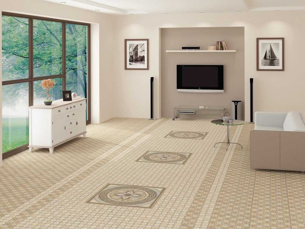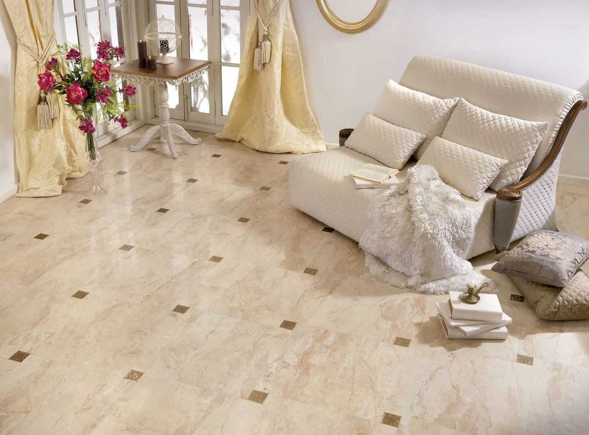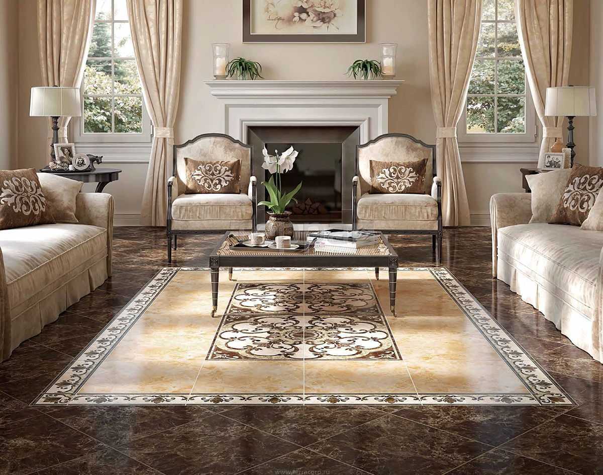 Напольная плитка в гостиной практична и красиво представлена в фото-галерее. Кроме того, она идеально подходят для популярного теплого пола. Рассмотрите самые модные аранжировки этого сезона.