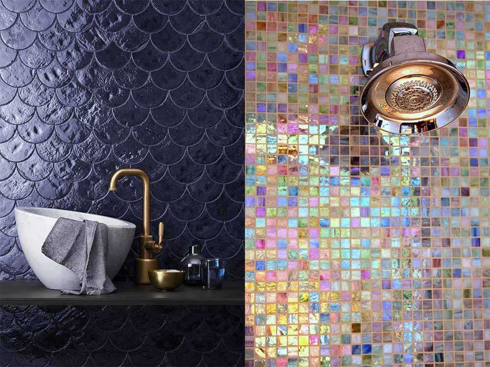 Очень интересно выглядит плитка с узором чешуи радужными переливами