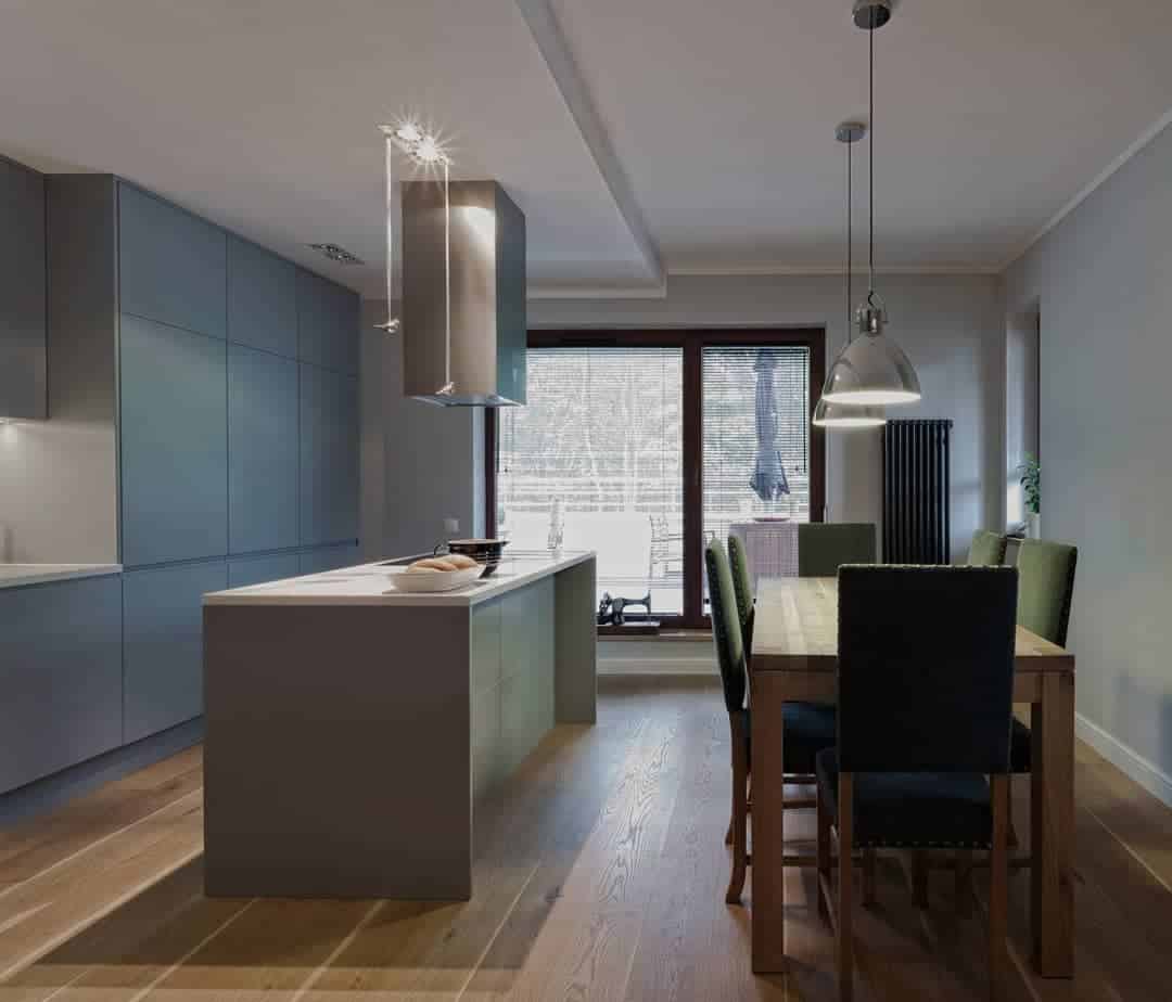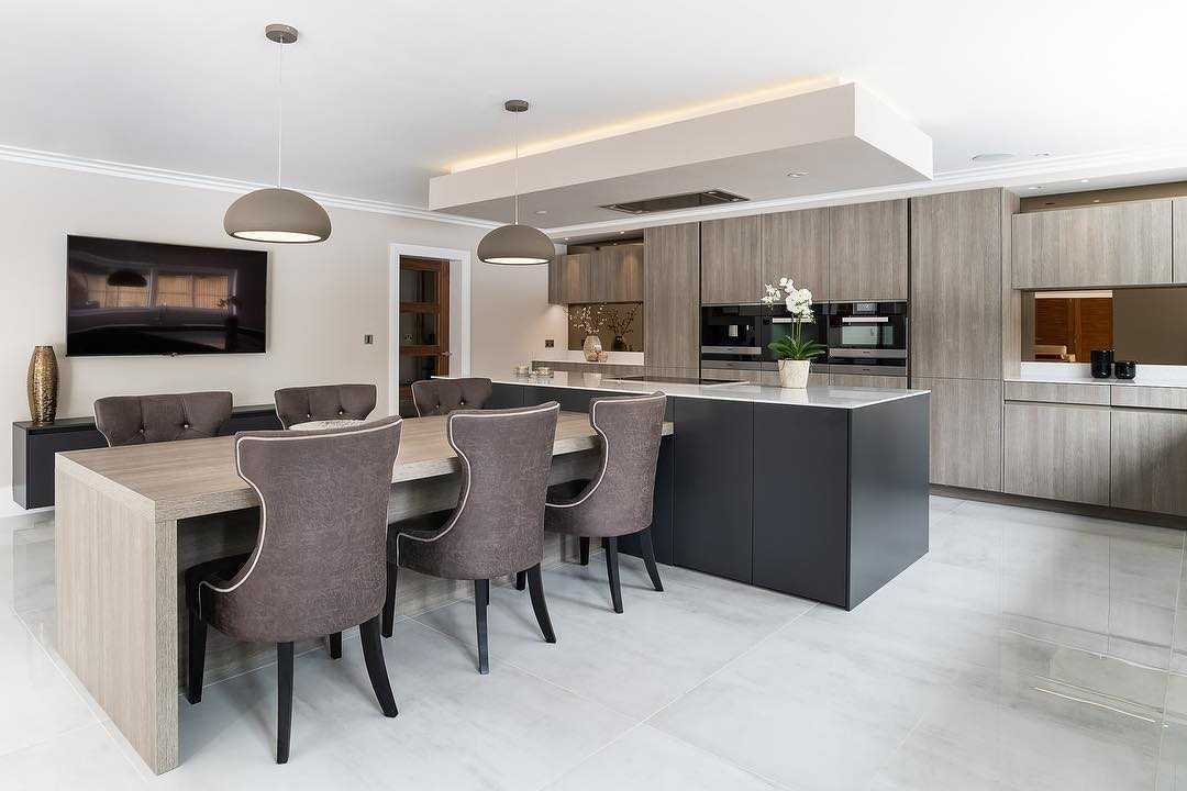 Значительная площадь помещения в большинстве случаев предполагает присутствие островной конструкции, присутствие которой может быть акцентировано, например, контрастным оттенком.