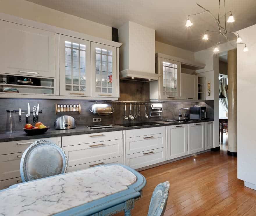 Чаще всего, чтобы избежать этой проблемы, светильники в этом помещении располагают в двух зонах — рабочей и столовой. Над столом вешают люстру с несколькими рожками, а место приготовления пищи, помимо главной люстры, подсвечивают дополнительно точечными светильниками или узкими светодиодными лампами.Их размещают над раковиной и плитой.