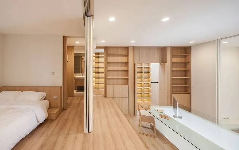 В дизайне джапанди каждый предмет имеет собственное место. Для упорядоченности пространства устанавливают открытую и закрытую мебель, модульные гарнитуры и встроенные конструкции. Расставить акценты в помещении помогут низкие предметы интерьера (столы, кушетки, кровати).