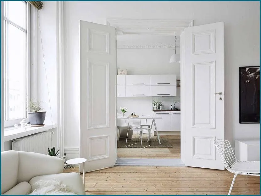 Еще один простой ход, способный облагородить даже простой интерьер: распашные белые двери в сочетании с монохромным белым интерьером. Отлично подойдут к такому сочетанию фактурные детали, предметы интерьера с историей – пусть не всегда в идеальном состоянии, но такие, где каждая царапина передает атмосферу своего времени.