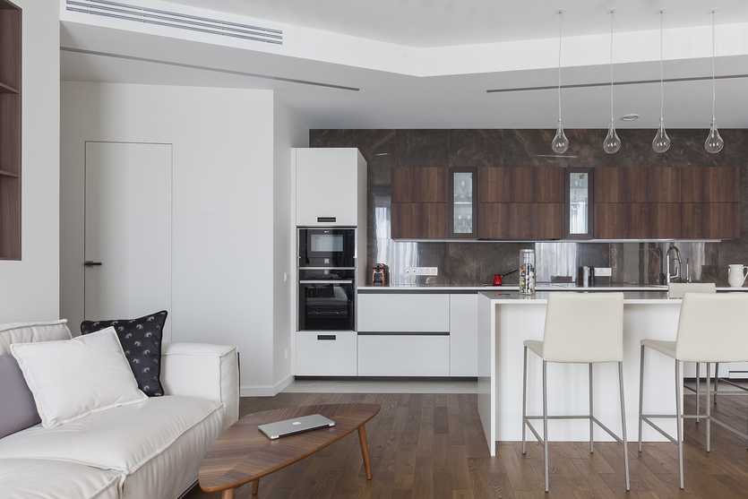 Автор проекта: Гульшат Байжан. Пространство кухни отделено от гостиной лёгкой стеклянной перегородкой. Когда дверца сдвинута, переплёты образуют красивый геометрически чёткий рисунок.