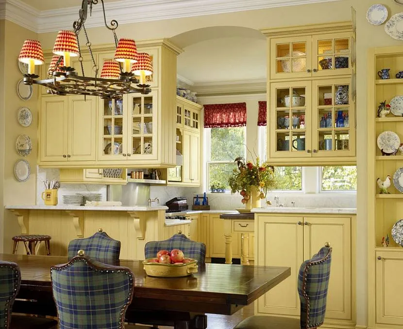 Уютная кухня в стиле кантри и приятном желтом цветеИсточник comfortoria.ru
