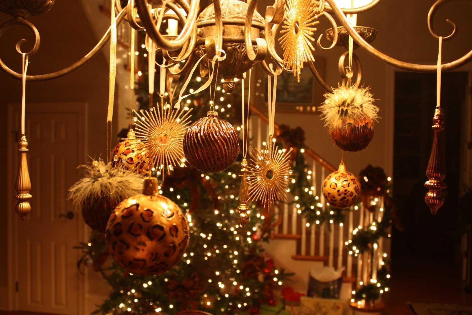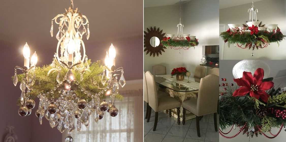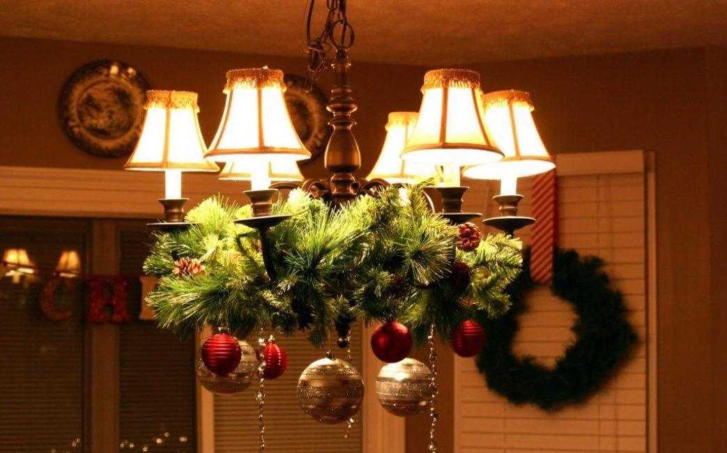 - Украсьте люстру. Возьмите для этого яркую мишуру.