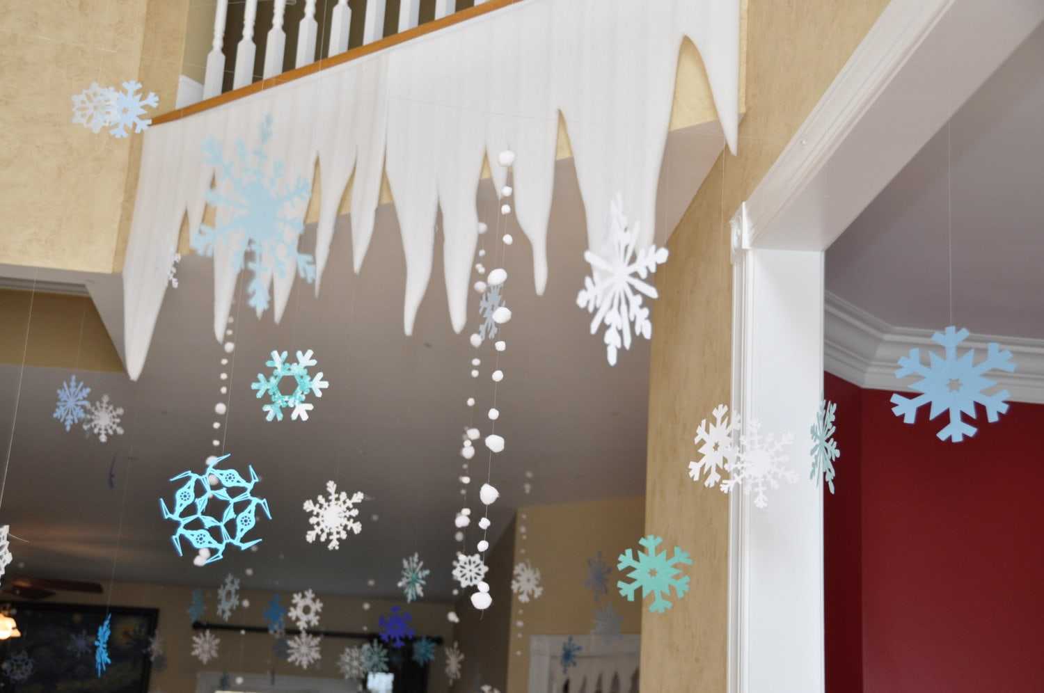 - С помощью воздушных шариков и бумаги можно сделать снежинки. Из бумаги сделайте аппликации в виде снежинок, затем с помощью нитки привяжите их к шарикам. Это позволит поднять их в воздух.