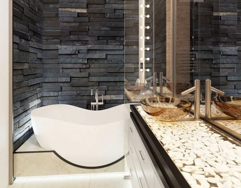 Стены лучше всего оформить с помощью керамической плитки. Поверхность изделия бывает гладкой или фактурной. Для выделения нескольких отдельных зон подбирайте контрастные оттенки. Хорошо подойдут классические цвета направления – белый и черный.