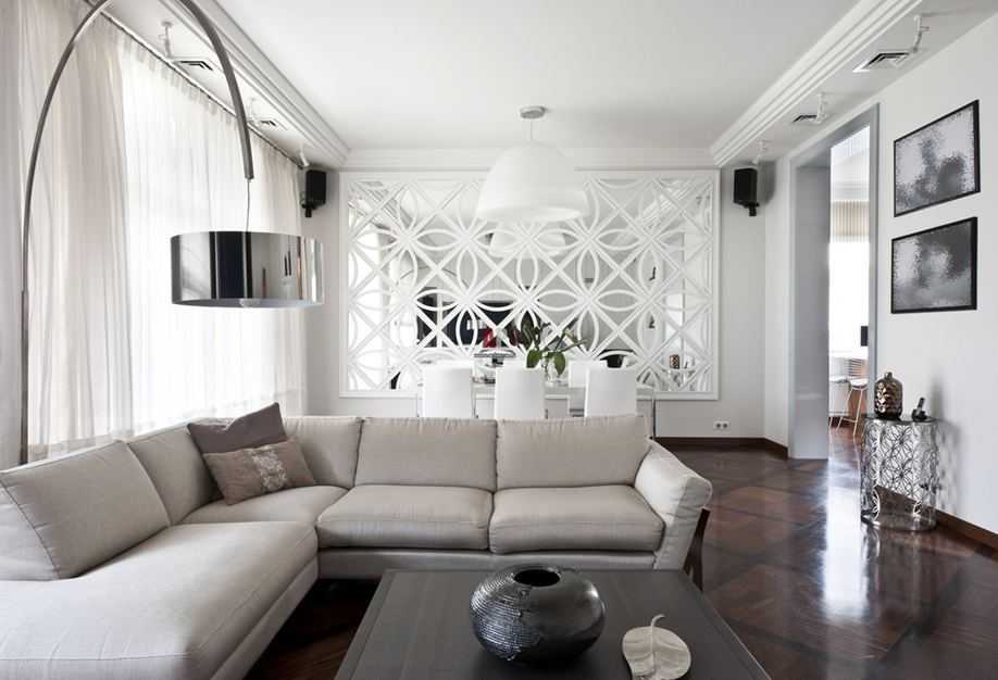 Цвет. Особых предпочтений в цветовом оформлении зала нет – в моде разнообразие, но с упором на черно-белую либо пастельную палитру. Нежности интерьеру добавляют оттенки слоновой кости, кремовый, бежевый, светлый терракот, кофе с молоком, светло-серый.