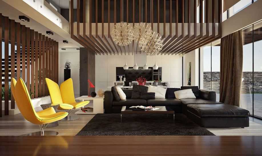 Акцент на высокий потолок. Этот тренд подойдет для просторных гостиных с высокими стенами