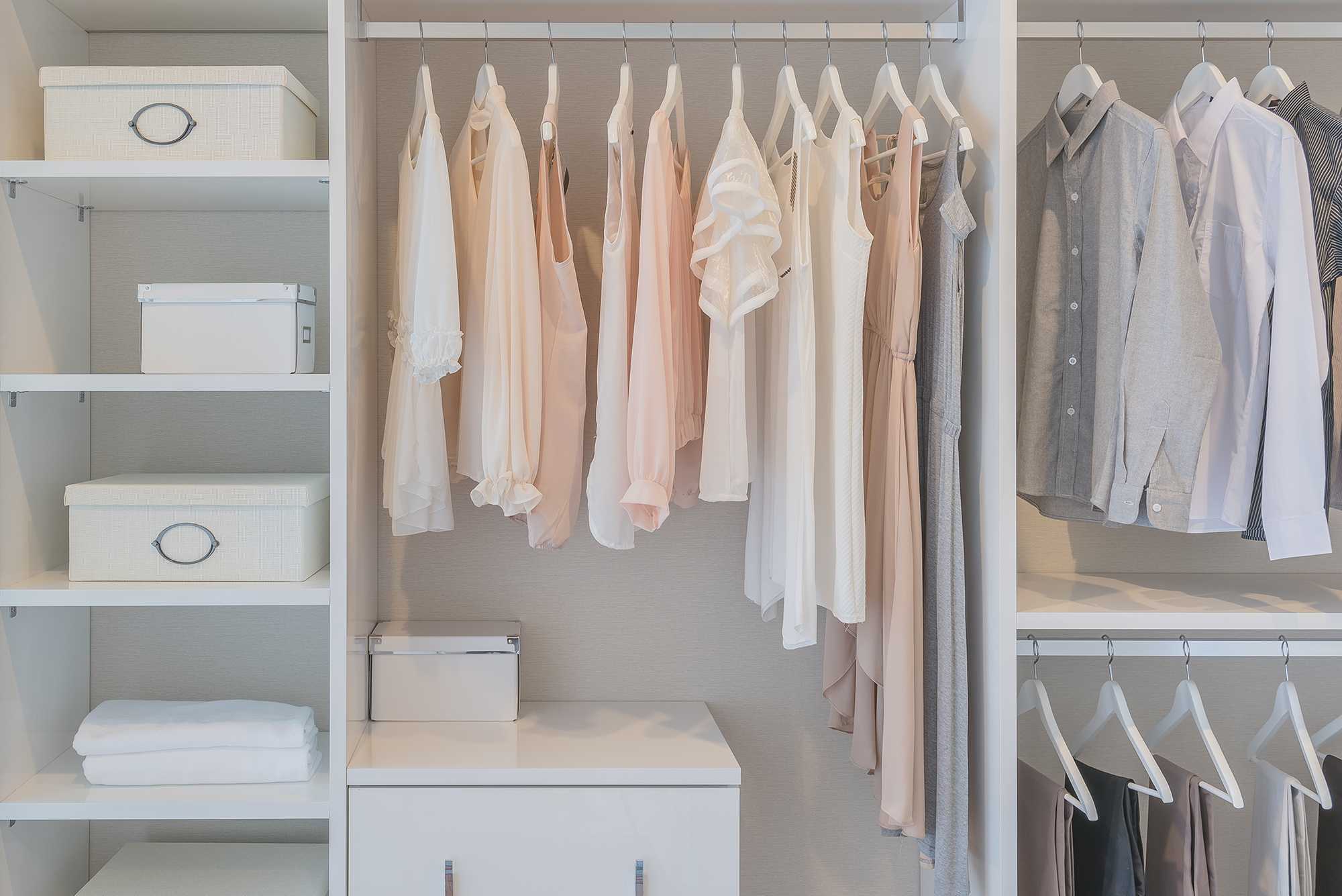 Те вещи, которые хранятся на вешалках, также вывешиваются по категориям. Располагать одежду следует следующим образом: длинные, тяжелые вещи слева, более легкие с правой стороны.