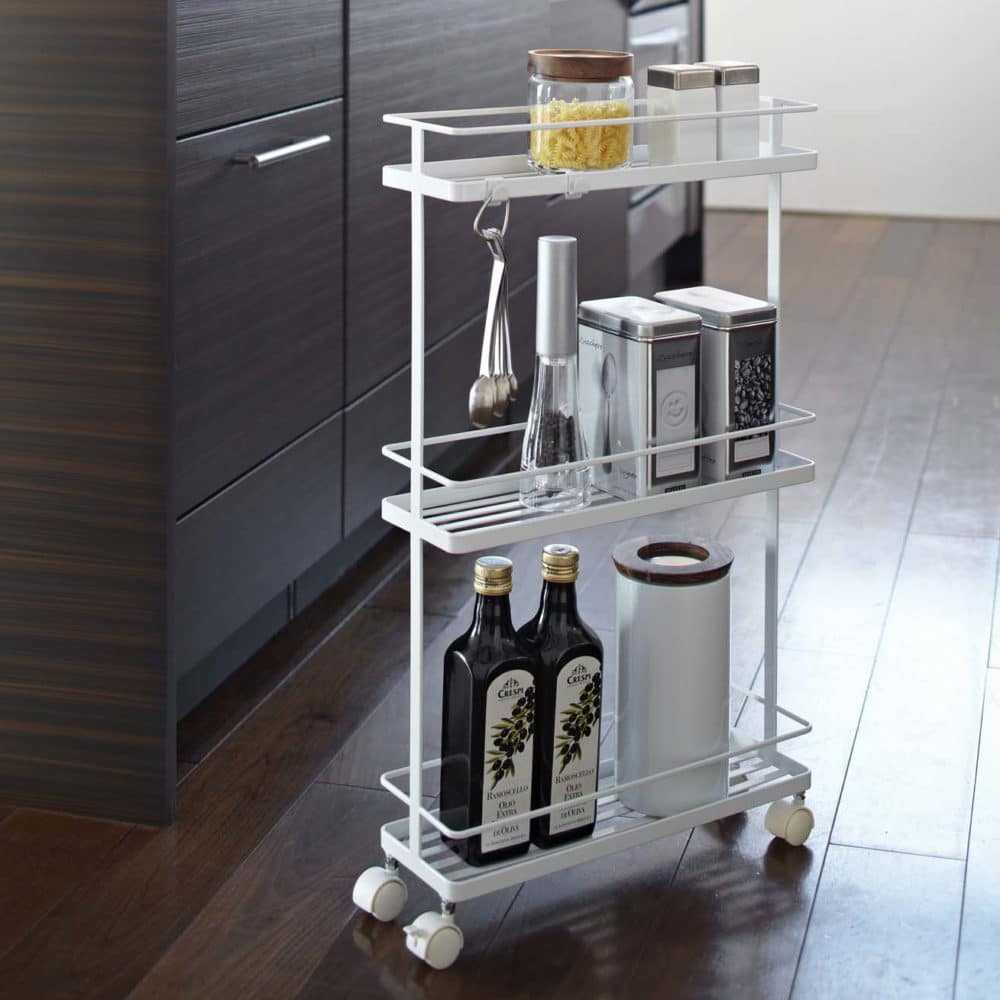 Узкая этажерка на колёсиках — наш фаворит. Её можно задвинуть в пространство между плитой и кухонными шкафами, а при необходимости без труда переместить в любое другое место или даже помещение.