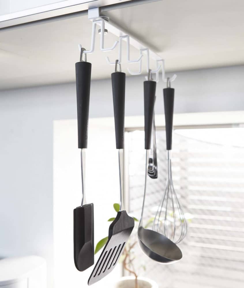 лаконичная белая полочка, которую прикрепить можно к любой стене и даже холодильнику, отлично справляется с размещением мелких кухонных инструментов;