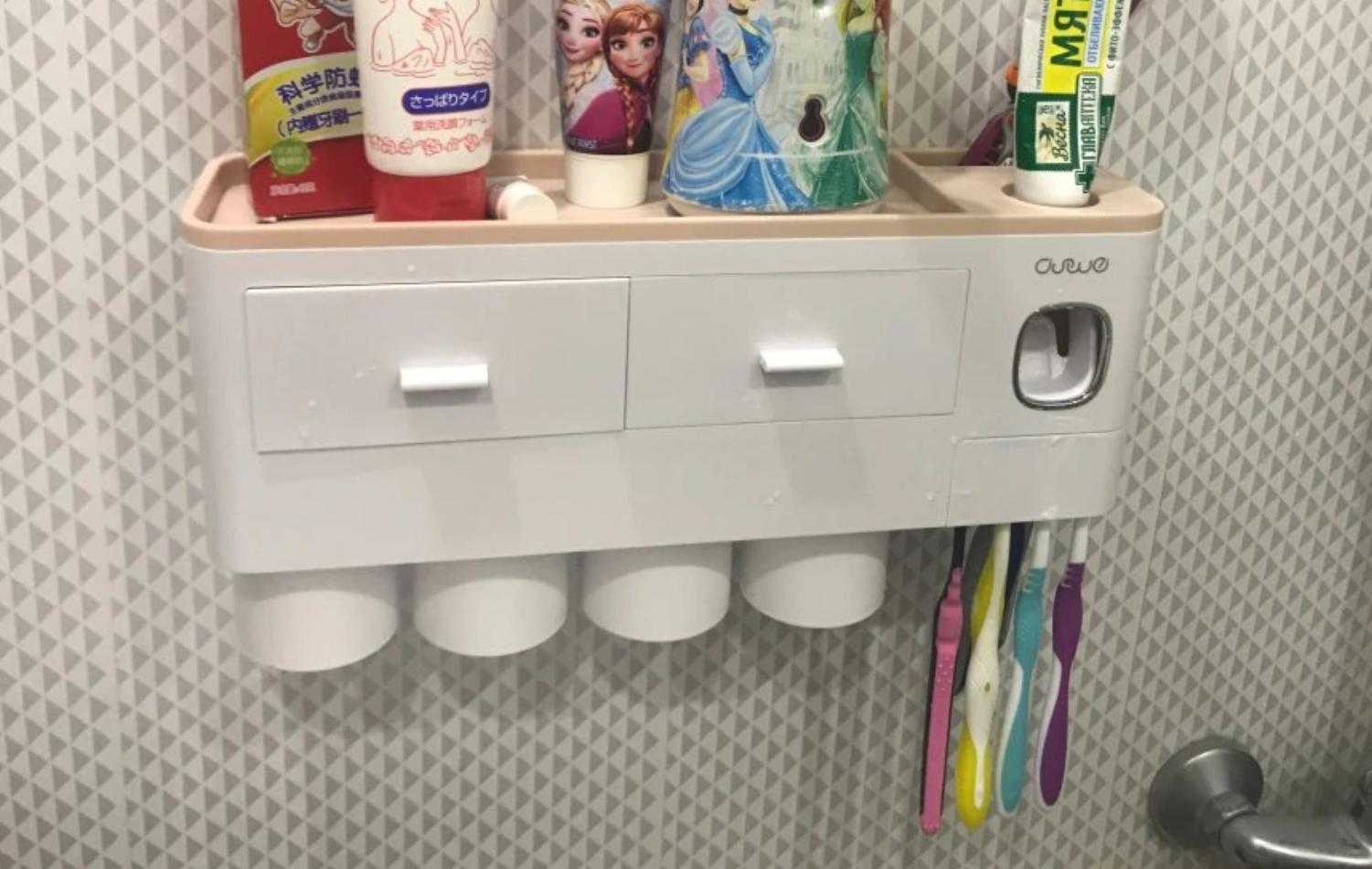 Настенная полка-стеллаж для туалетных принадлежностей, в том числе, держатель для зубных щеток и набор аксессуаров для ванной комнаты. Кто бы мог подумать, что хранение зубных щеток может быть столь технологичным. Вместо того, чтобы привычно оставлять их в стакане, предлагается размещать их на держателях специальных полок.