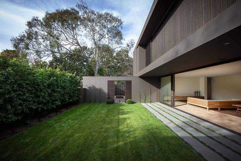 Минимализм подразумевает небольшое разнообразие растений и геометрически правильные формы, не отвлекающие внимания. Идеально ровный газон и более крупные насаждения по бокам — это все, что должно находиться на приусадебном участке.