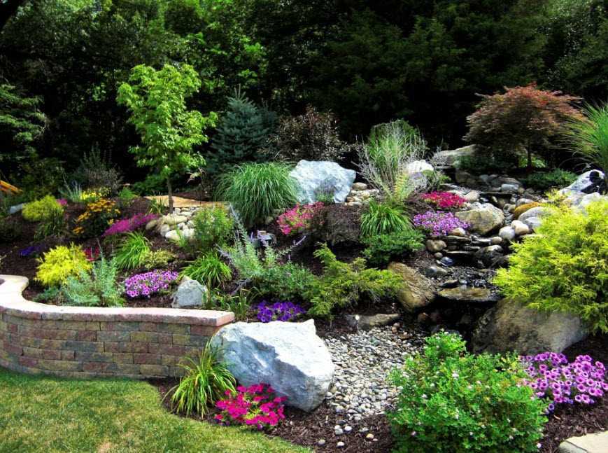 По берегу ручья и пруда высадить влаголюбивые растения, на камнях — подходящие их альпийских трав, цветов и многолетников. Такое сооружение, безусловно, сложнее в техническом плане, больше требует оно и затрат — пруд, ручей, горка — все требует вложений. Такие сложные системы считаются уже ландшафтными горками, так как частично меняют внешний вид всего участка.