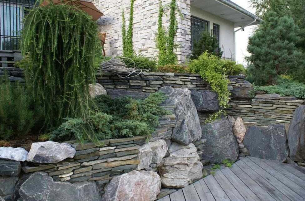 И еще один вид альпинариев — террасы. Разбиение участка на террасы необходимо, если он находится на склоне. Тогда многоуровневое устройство — лучший выход. Для выравнивания грунта укладывают подпорные стенки. Их чаще делают из армированного бетона, а украшают затем валунами. На этих подпорных стенках тоже отлично себя чувствуют почвопокровные растения.