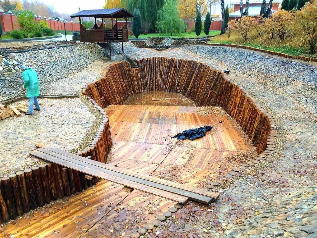 Так или иначе, декоративный водоем можно построить без какой-либо помощи и за один сезон. Подготовленное углубление укрепляют железобетоном: по его стенкам и дну прокладывают арматуру, увязывая ее в местах пересечения или скрепляя с помощью сварки. Готовую конструкцию фиксируют шпильками и набрасывают раствор из бетона. Стяжка должна полностью застыть, после чего всю поверхность бассейна обрабатывают герметиком. Последний этап — оформление бортиков.