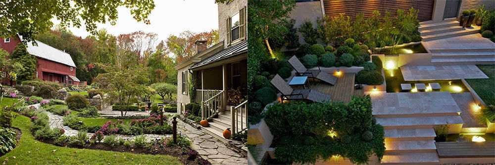 Контраст светлых и темных цветов, природного и искусственного — это то, что нужно. При этом из растительности часто используются только трава и деревья.