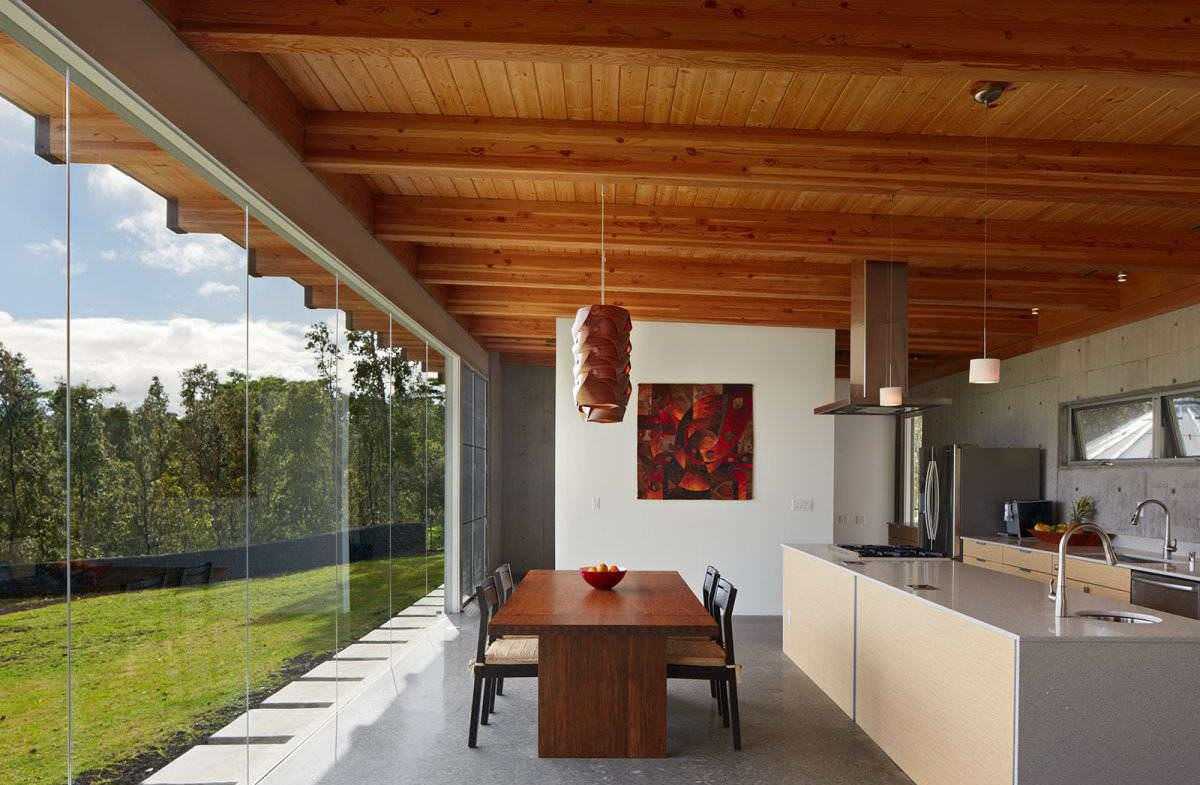 На фото деревянные МДФ панели на потолке в интерьере кухни.