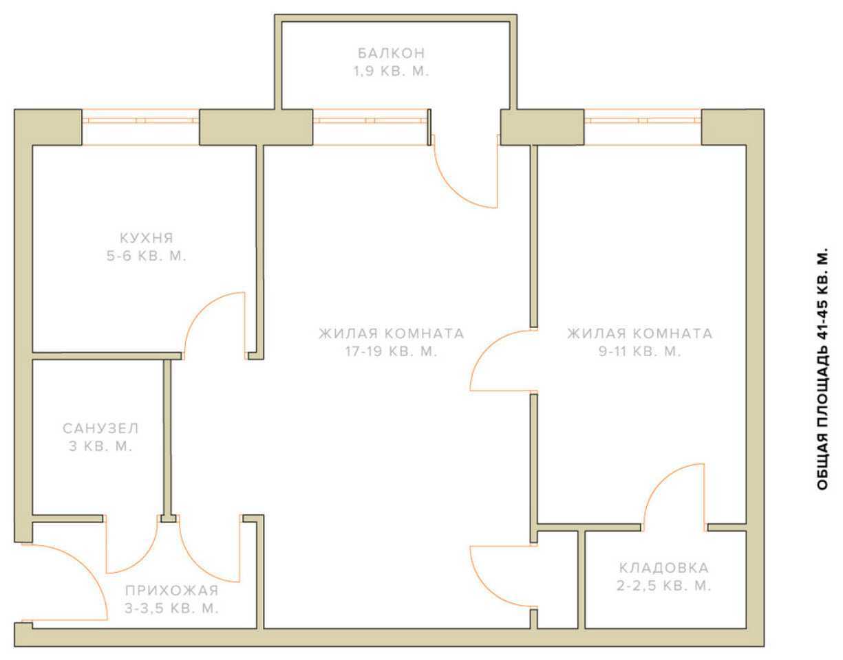 Стандартная двухкомнатная квартира в хрущевке имеет два смежных жилых пространства, кладовку, мини-кухню, прихожую и ванную. Проживание в таких апартаментах не приносит особого комфорта, поэтому следует подумать о возможных вариантах перепланировки. Итак, если изначально ваша квартира была такой как на представленном фото, то можно выбрать три варианта ее трансформации.
