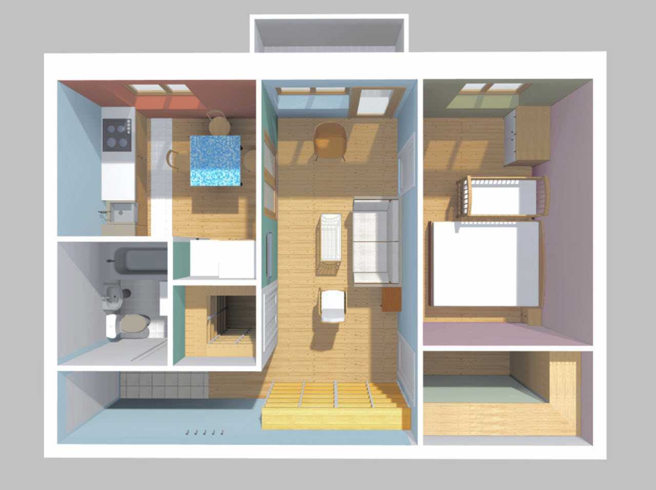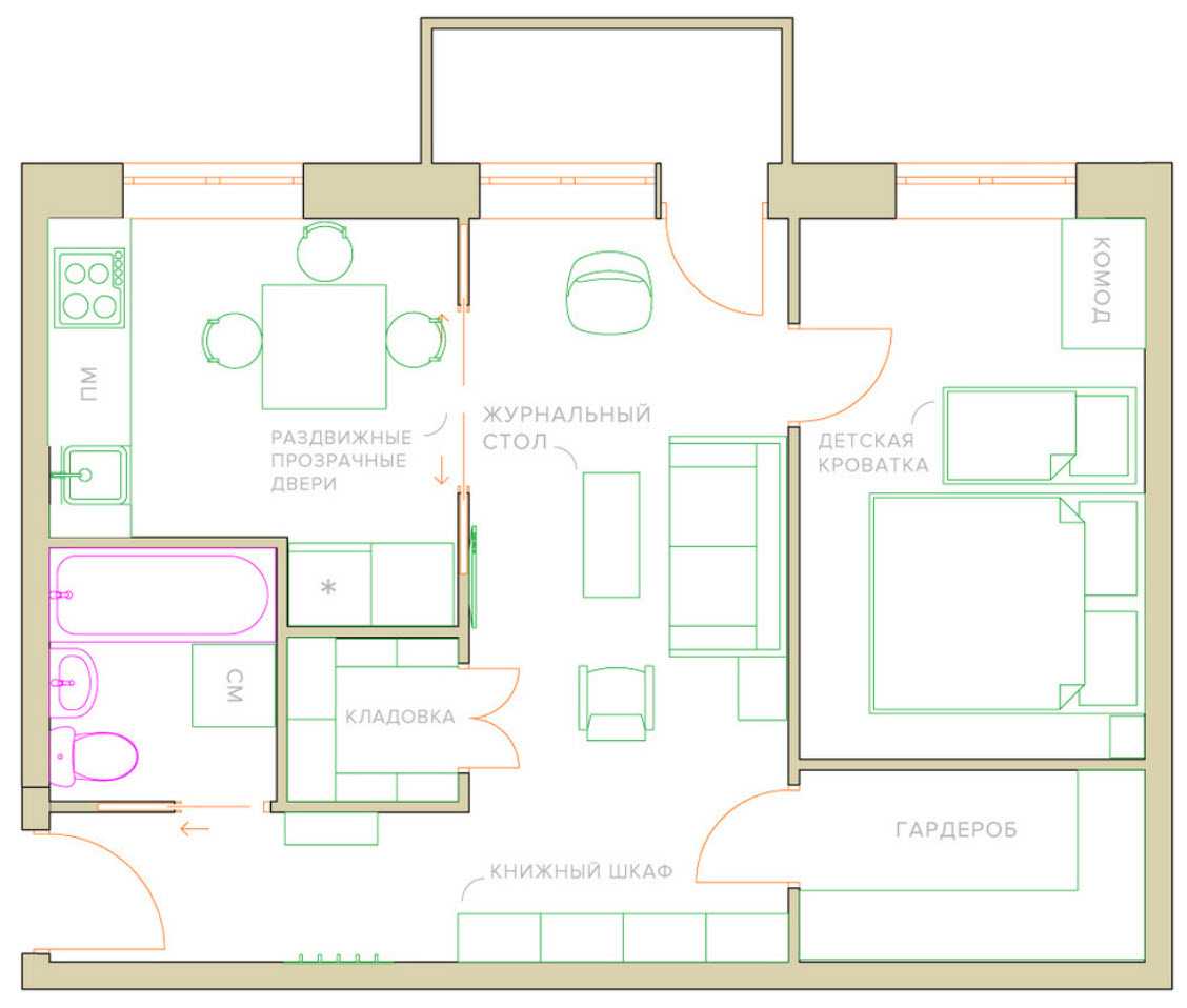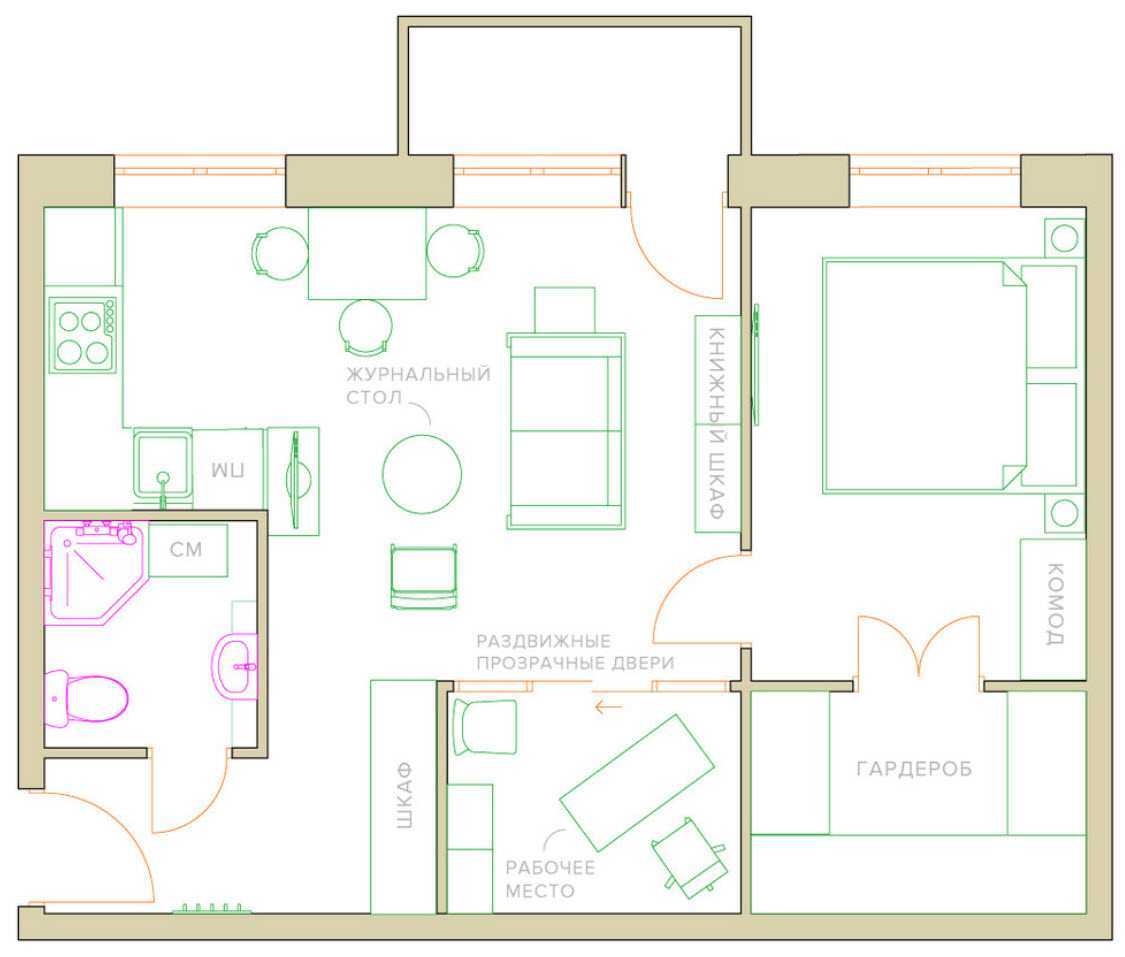 Таким образом останется только одно, общее помещение и санузел. Такой вариант очень удобен для молодых пар, у которых еще нет детей, а также для студентов, которые ищут удобное и выгодное жилье.