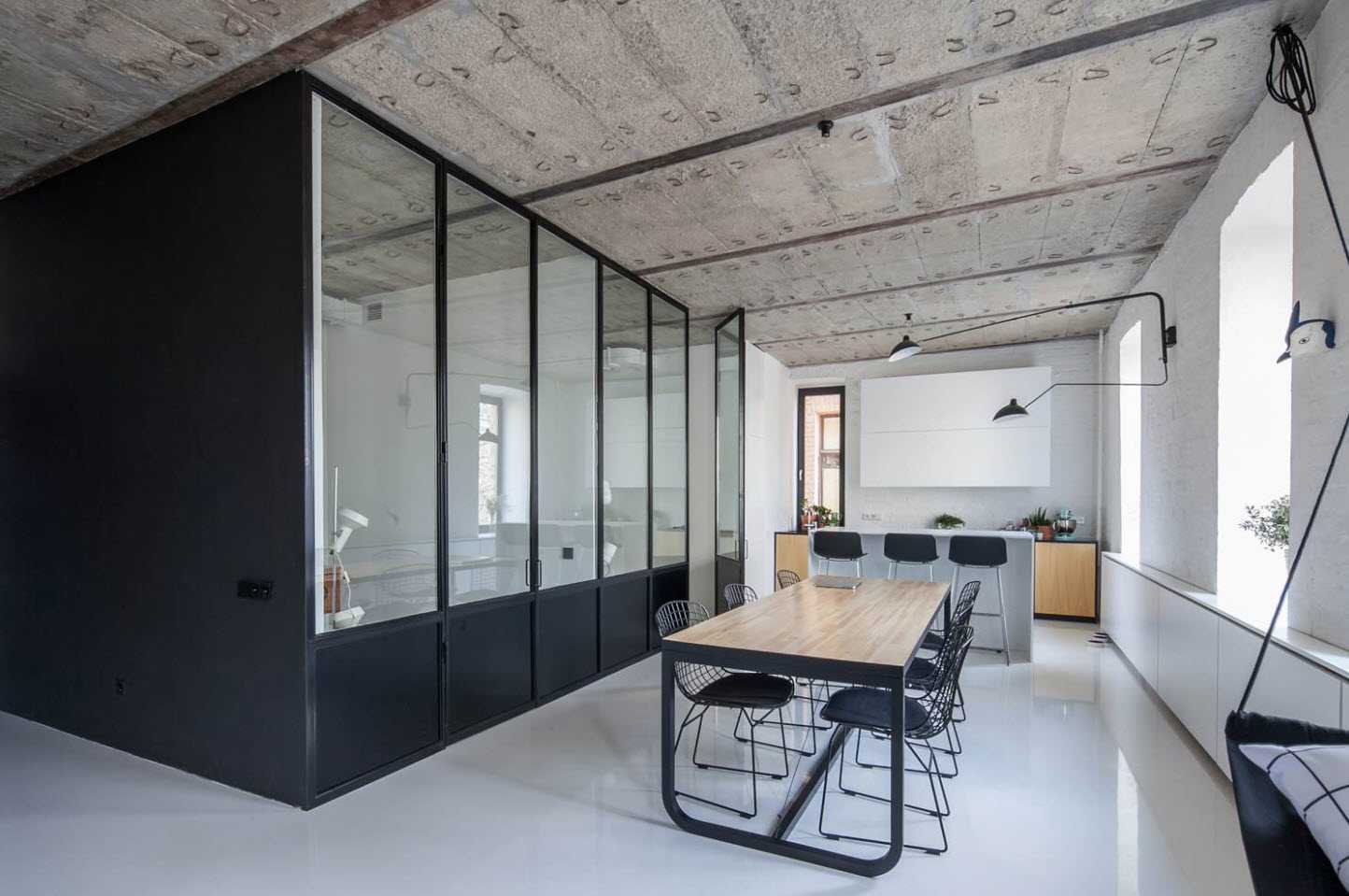 - Разграничение рабочего и домашнего пространства с помощью легких гипсокартонных перегородок или открытых стеллажей, штор или раздвижных ширм.