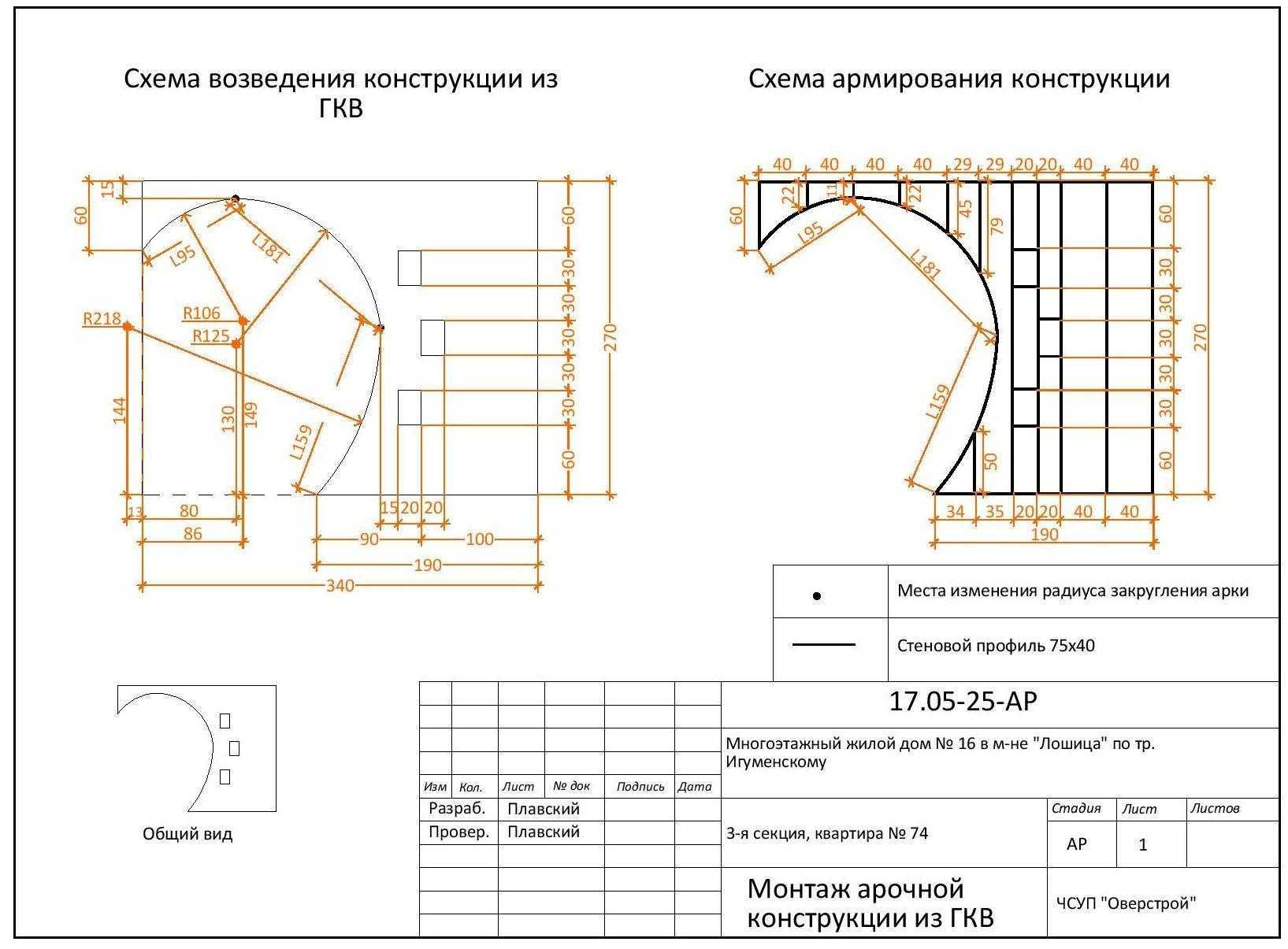Как видно из чертежа, кривая арочного проема достаточно сложна, имеет несколько сопряженных радиусных дуг, дополнительно конструкция имеет три прямоугольных небольших проема. Схема армирования перегородки основана на использовании нескольких вертикальных стоек полной длины и большого количества скрепляющих перемычек, а также арочного профиля. Общее количество необходимых материалов здесь посчитать сложнее, причем необходимо учитывать запас не менее 10…15% на случай непредвиденных сложностей при раскрое профиля и ГКЛ. Укрупненно расчет делается на основании данных чертежа: