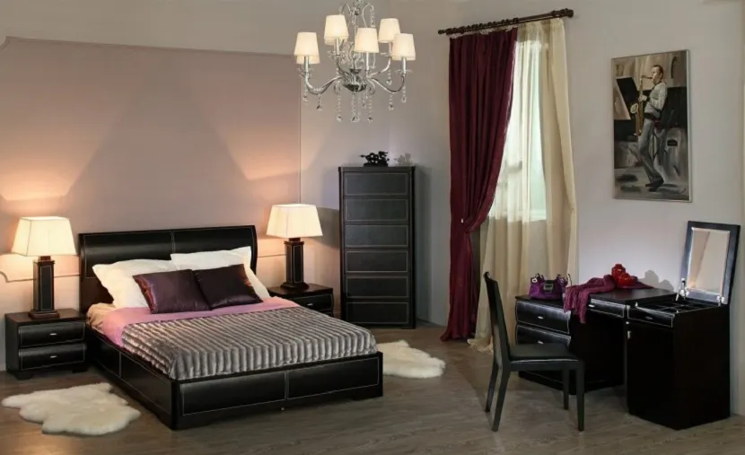 Розовый пол под мрамор и розовые стены удачно сочетаются с чёрной кроватью, чёрными прикроватными тумбочками