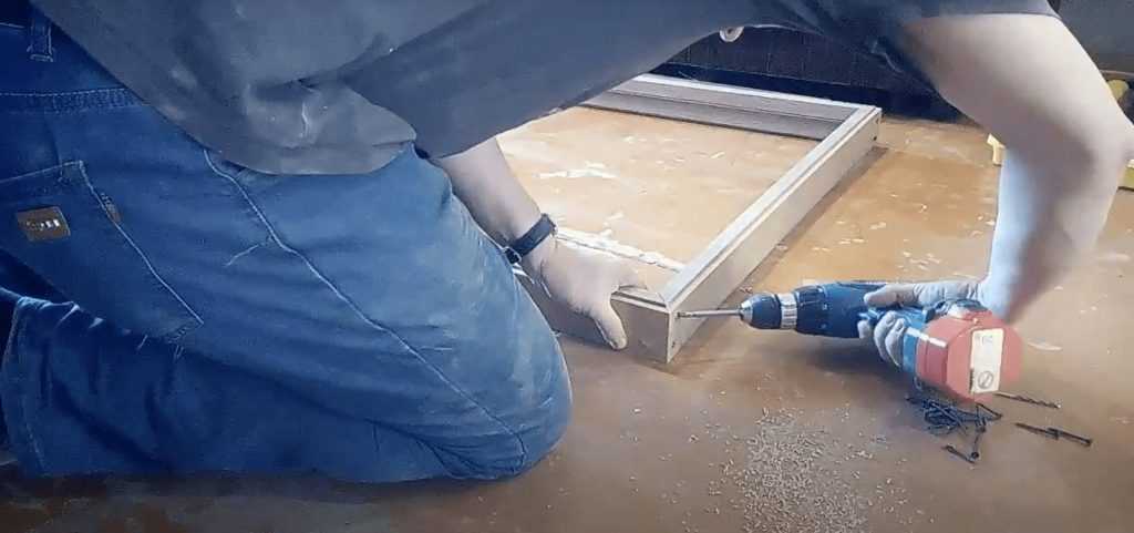 Как только все составляющие запилены, нужно переходить к сборке частей. Работать легче, положив их на пол. Для безопасности, сверло лучше использовать небольшого диаметра. Саморезы обязательно должны быть для дерева, прикручиваются они также под углом 45 градусов. Во время скрепления частей их надо плотно прижимать друг к другу, так как саморезы растягивают детали.
