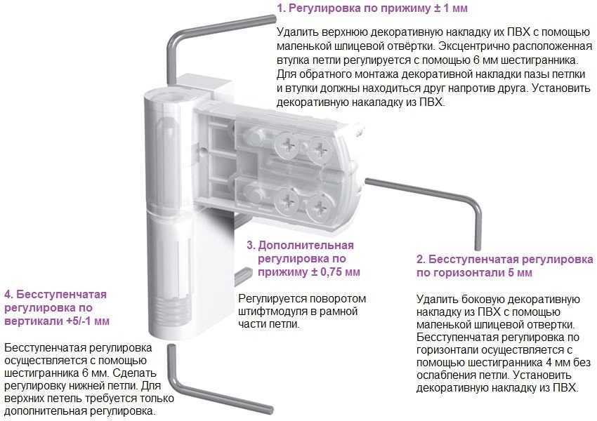 Регулирование пластиковых дверей производится повседневными инструментами и шестигранными ключами. Устройство основных креплений устройства из ПВХ предполагает проведение настройки пластиковых конструкций по нескольким характеристикам: