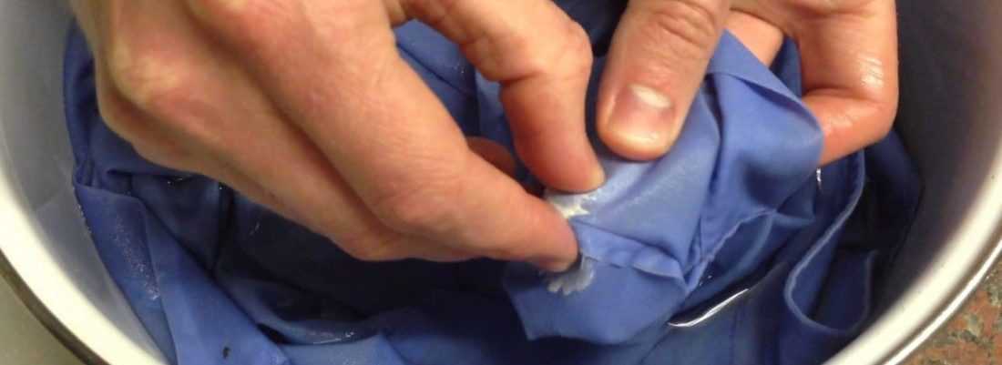 - Если в волокнах материала клей остался, можете замочить в полученном растворе вещь еще на 20-25 минут, а затем отправьте ее в стирку.