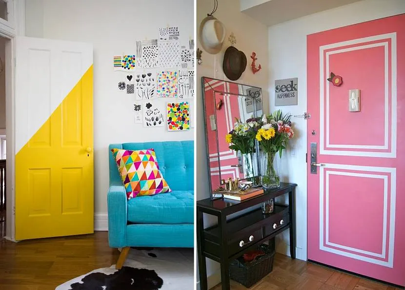 Окрашивание двери поможет акцентировать внимание и разбавить интерьер. Чтобы выполнить покраску, придется снять дверь с петель