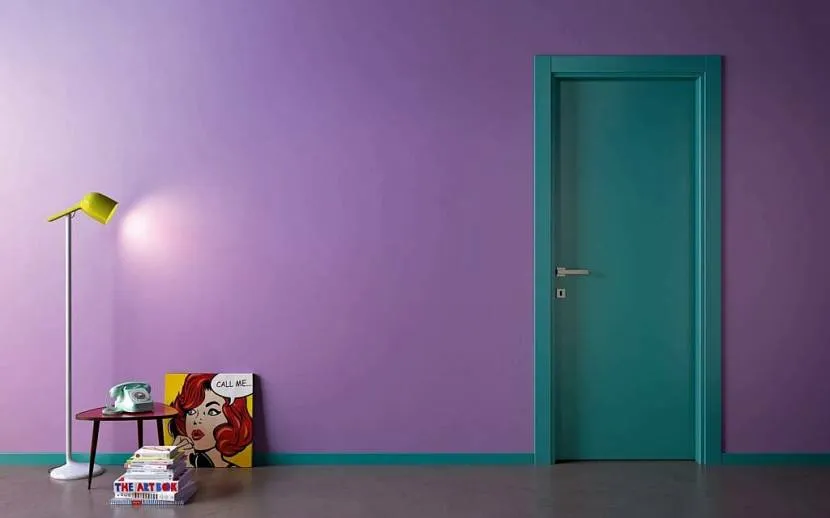 - Однотонная покраска. Этот вариант помогает правильно расставить акценты в монохромных интерьерах, если дверь окрашена в яркий цвет. Попробовав покрасить полотно в один из главных оттенков интерьера, можно поддержать общую палитру цветом.