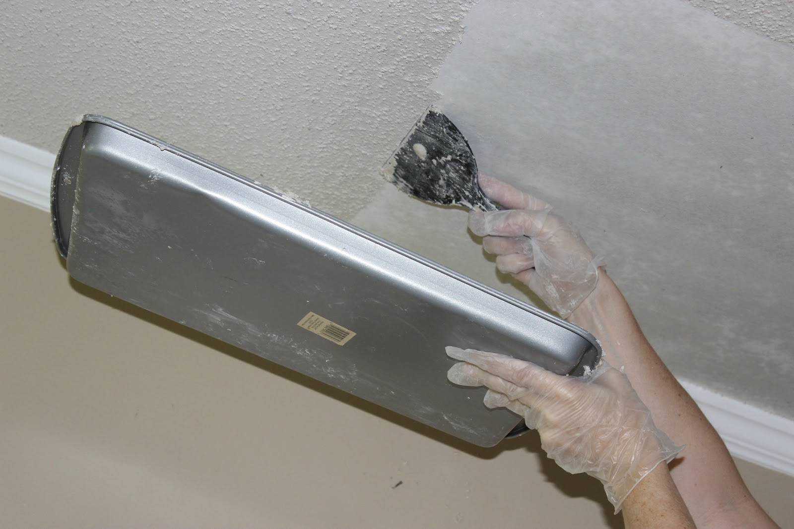 - Удаление побелки шпателем со щеткой с железными прутьями, после процесса производят промывку потолка чистящим веществом с водой;