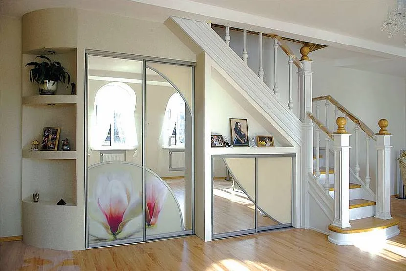 Шкаф-купе под лестницей — такая модель шкафа будет сочетаться с любым интерьером. Так как современные производители данной мебели открывают перед покупателями возможность в нанесении на дверцы шкафа любых рисунков, фотографий, а также декорируют двери комбинацией зеркал со стеклом, глянцевых и матовых поверхностей и т.д. Поэтому подобрать шкаф купе для любой комнаты вполне реально. Кроме этого, при заказе такого шкафа, покупатель самостоятельно выбирает количество полок и их расположение. Использование встроенного шкафа купе позволит сэкономить пространство и поместить в нем большое количество вещей. При наличии довольно крутой лестницы, рекомендуется комбинировать шкаф купе с другими типами шкафов, например, с распашными дверцами, так как сильно большой угол наклона не дает возможности нормально функционировать дверце шкафа.