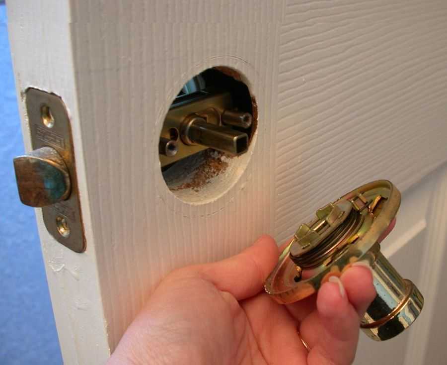 Теперь можно снять замок с входной двери, разобрать защелку, а при необходимости в дальнейшем снять личинку.